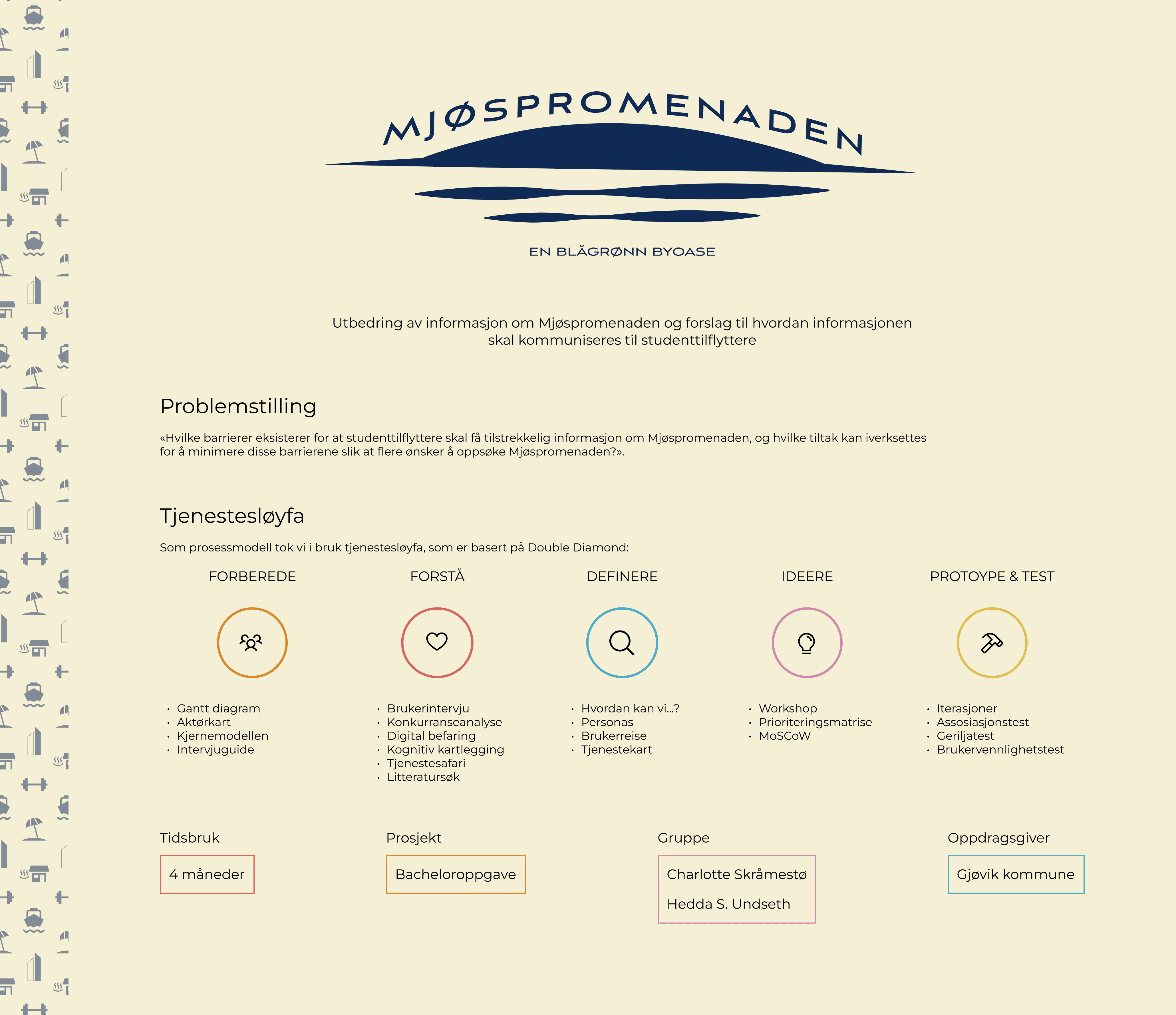Med utgangspunkt i problemstillingen definert av Gjøvik kommune har vi undersøkt hvilke barrierer som hindrer studenttilflyttere i å få informasjon om Mjøspromenaden. Mjøspromenaden er en tre km lang naturområde i Gjøvik. Mjøsa og omkringliggende naturområder representerer per dags dato et stort, men delvis ubrukt potensiale. Gjøvik som Mjøsby er i stor grad en del av byens identitet og har dype historiske røtter.