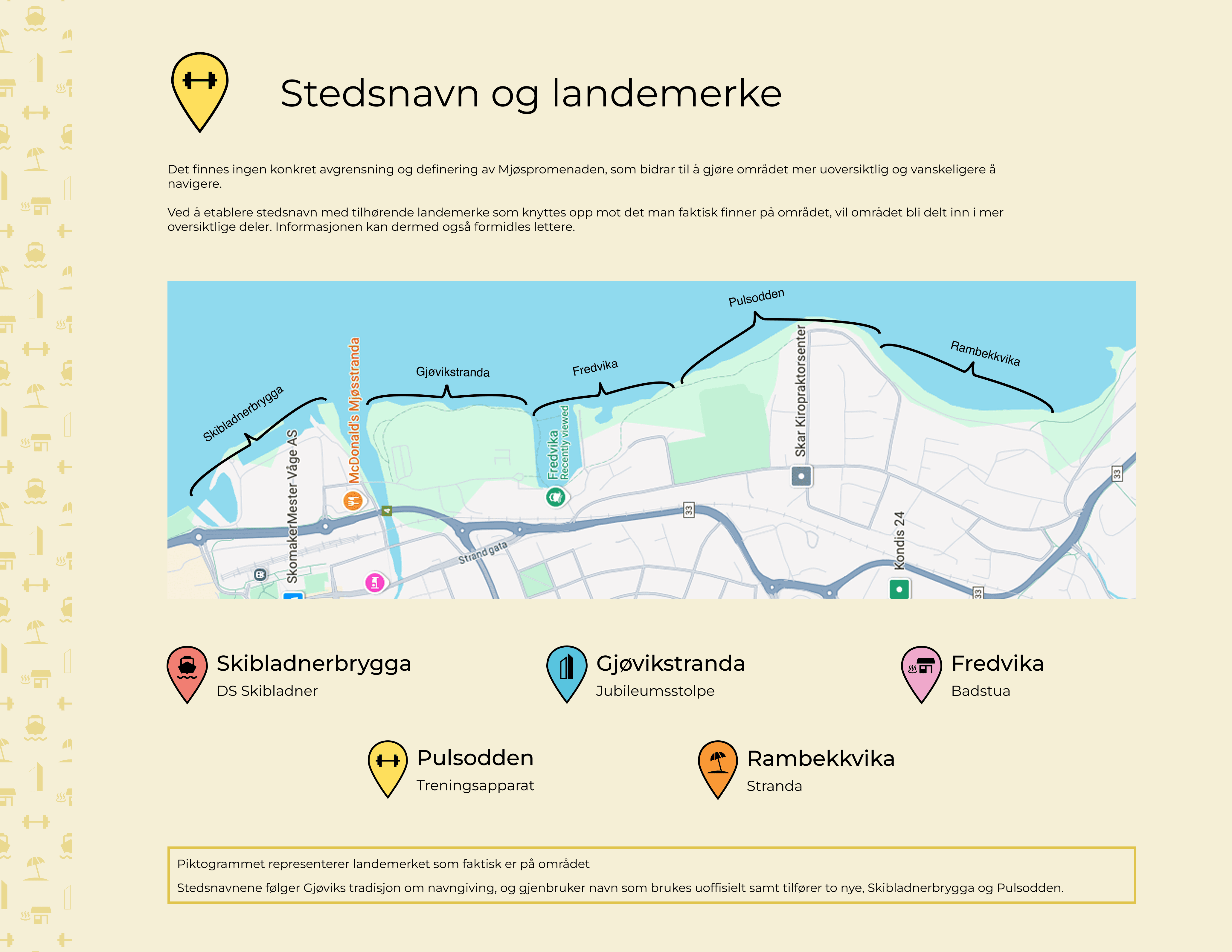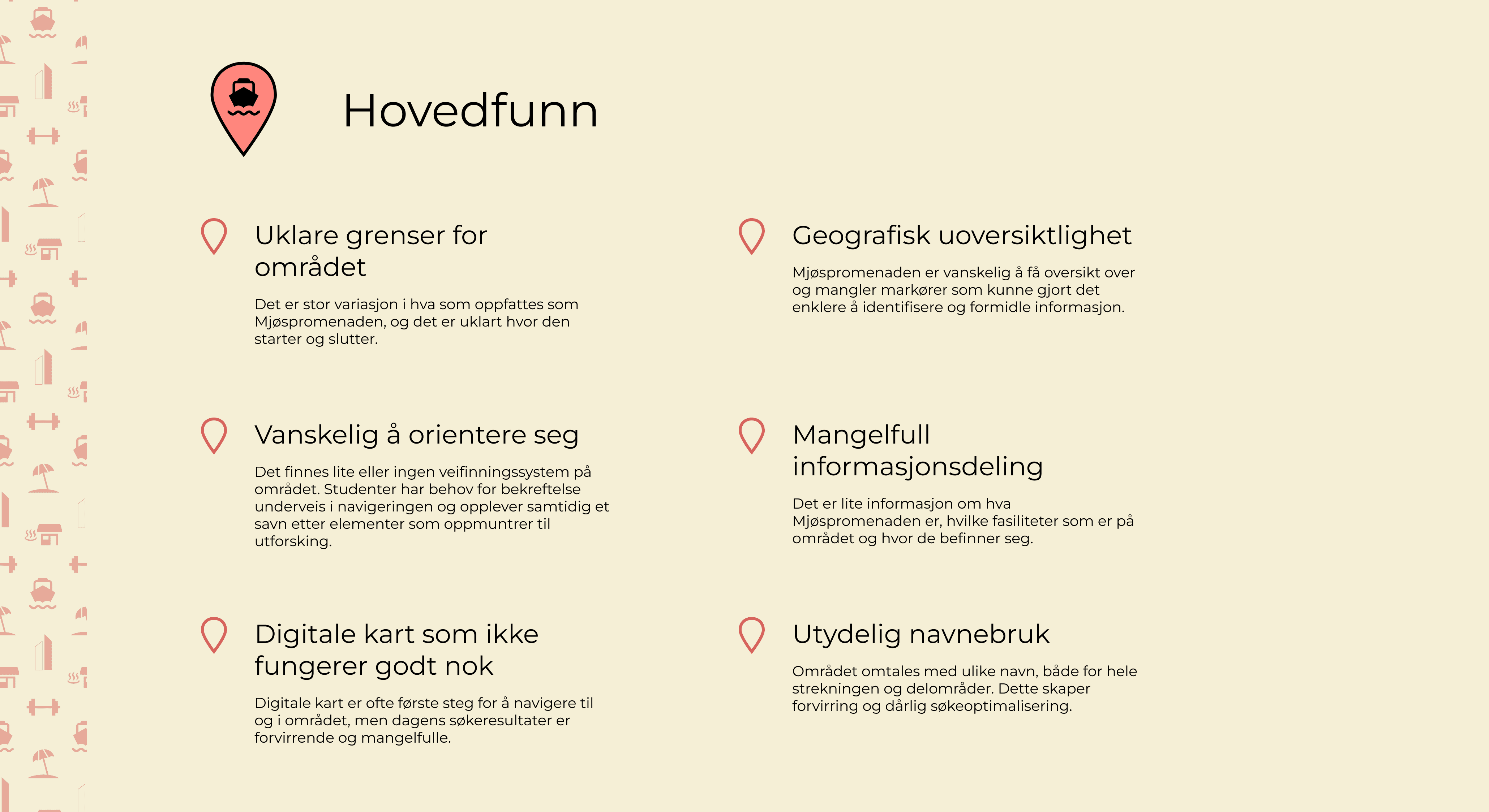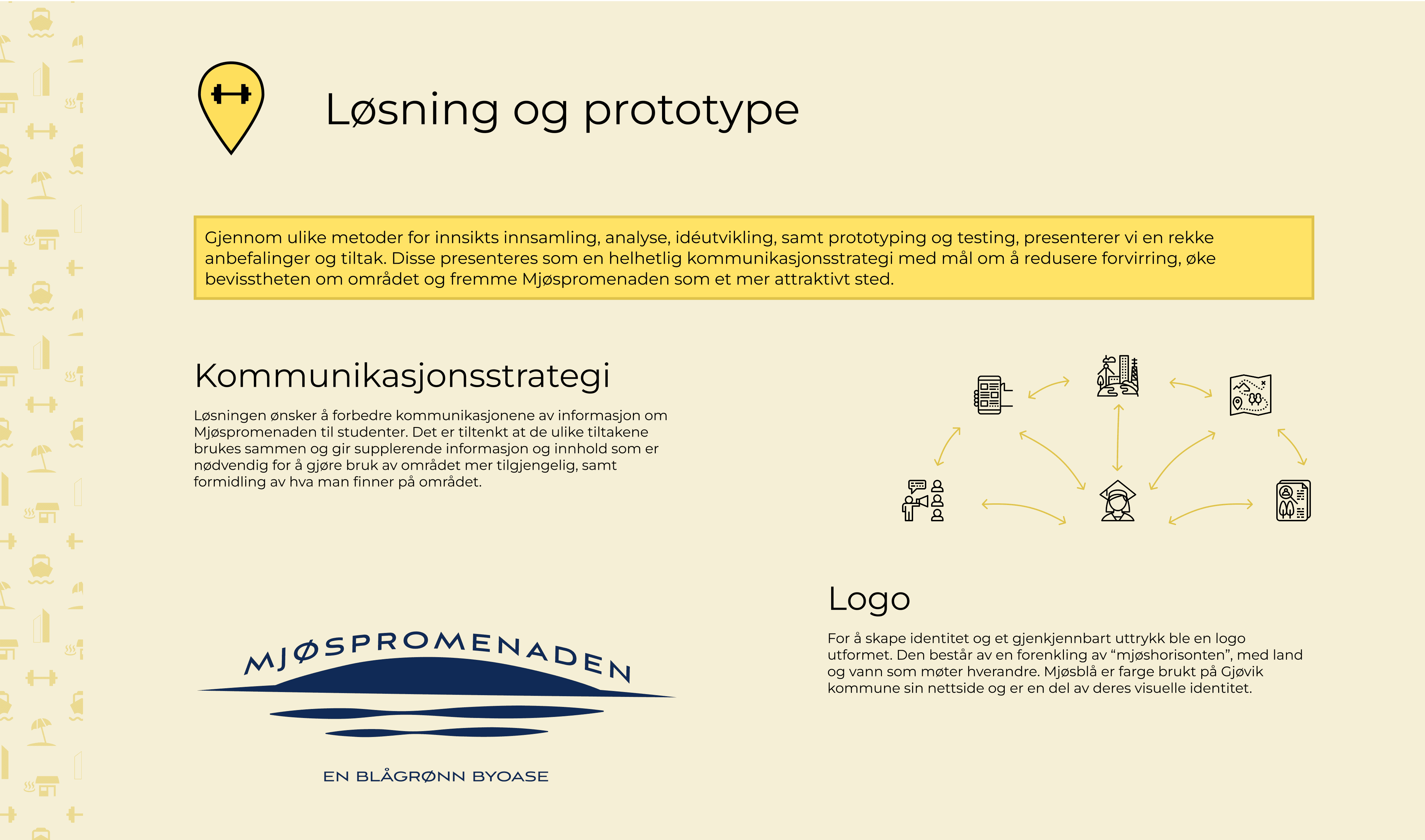 Funnene våre viser at manglende kunnskap og utilstrekkelig kommunikasjon knyttet til Mjøspromenaden bidrar til forvirring og gjør at området ikke blir utnyttet til sitt fulle potensial. Gjennom idéutvikling, prototyping og testing har vi derfor utviklet en rekke anbefalinger og tiltak. Resultatet presenteres i form av en helhetlig kommunikasjonsstrategi som skal redusere forvirringen, øke kunnskapen om området og styrke Mjøspromenadens posisjon som et attraktivt sted å bruke og besøke.