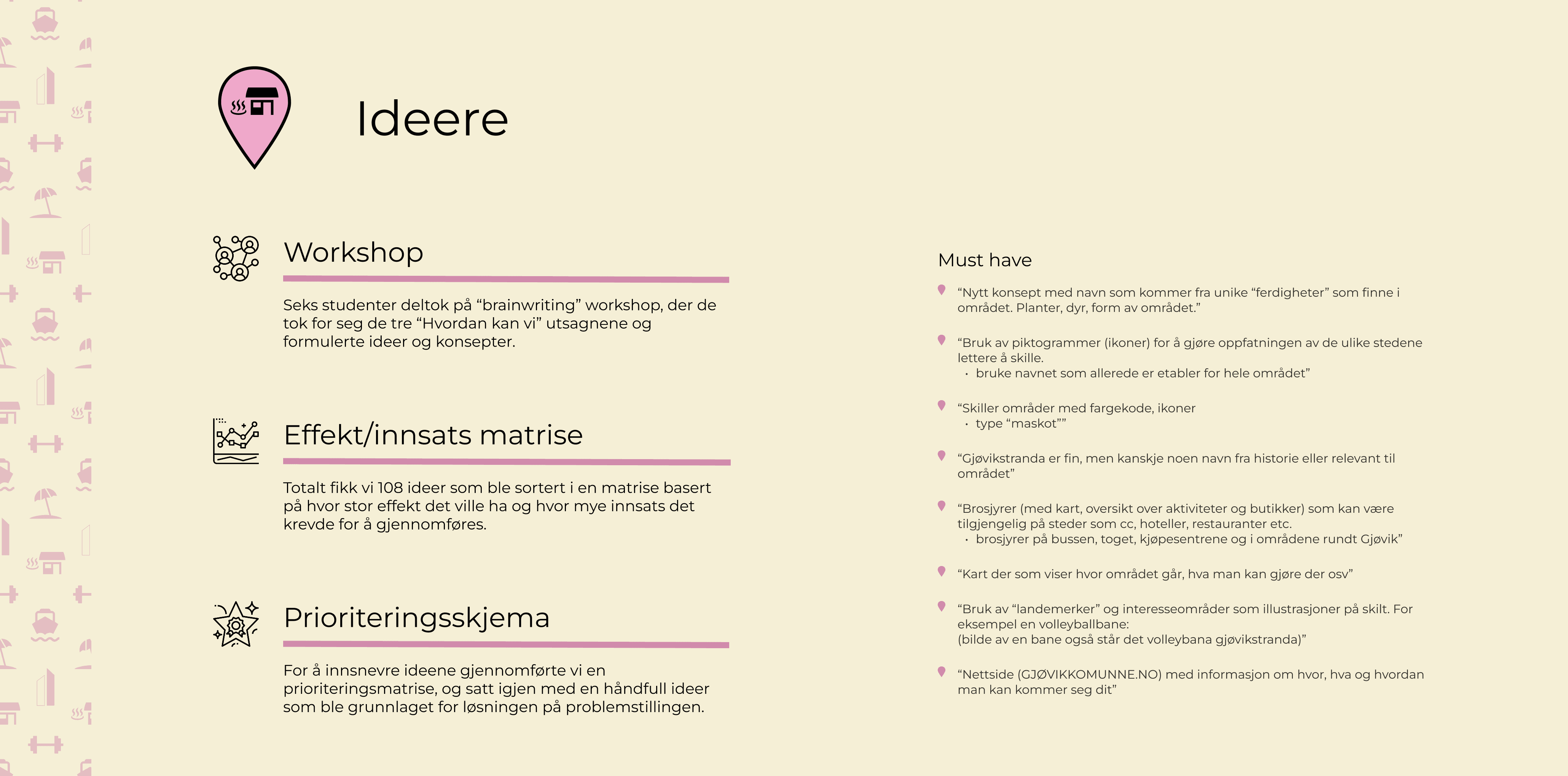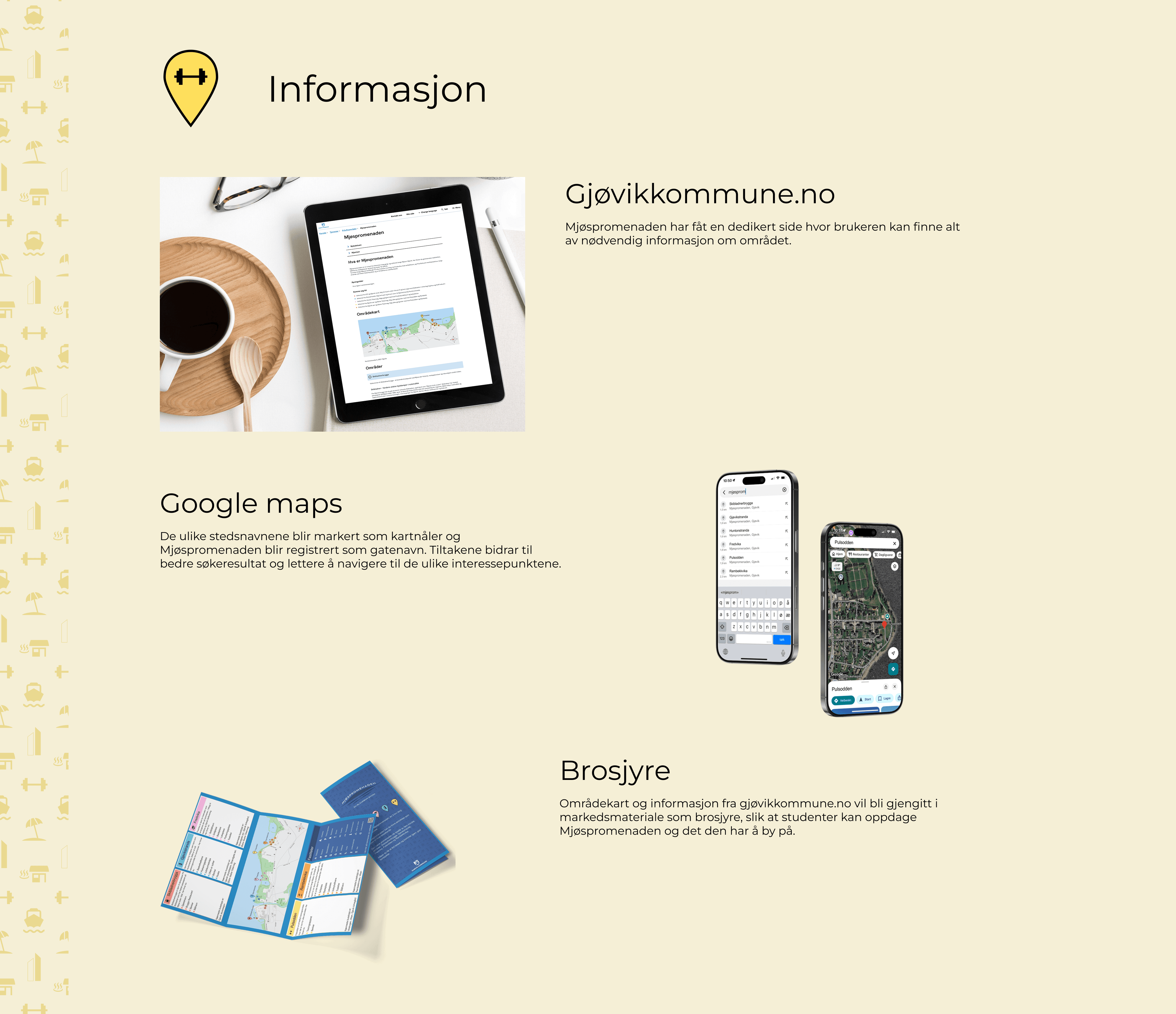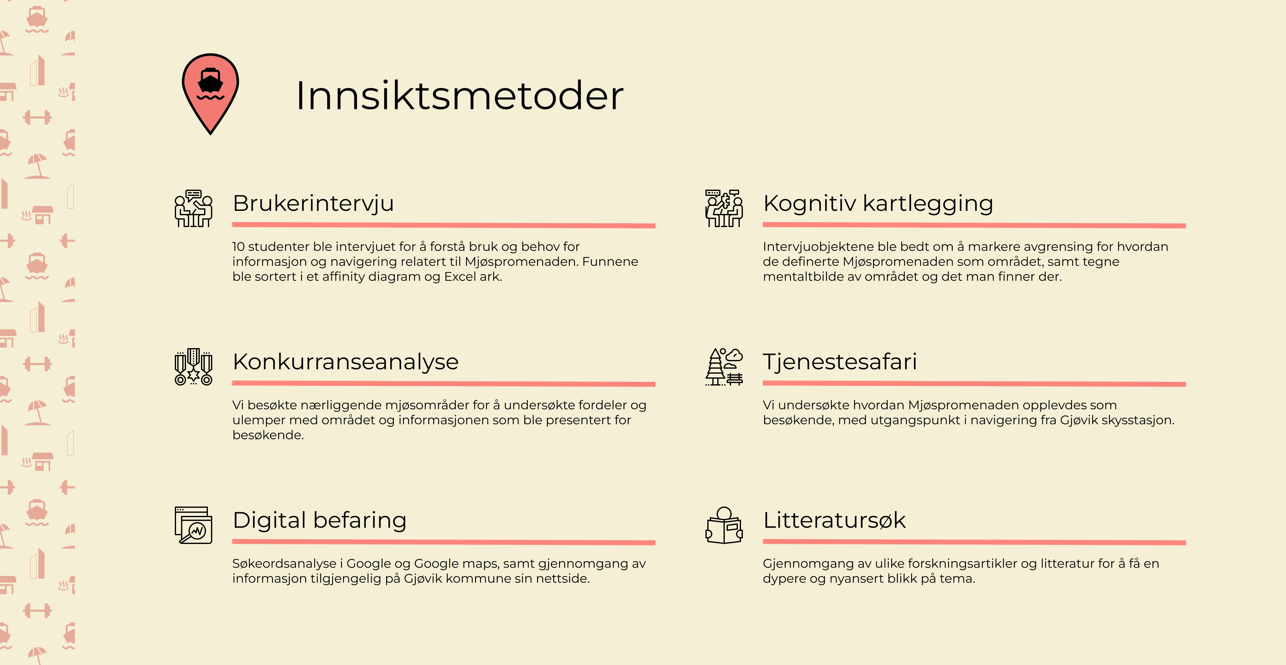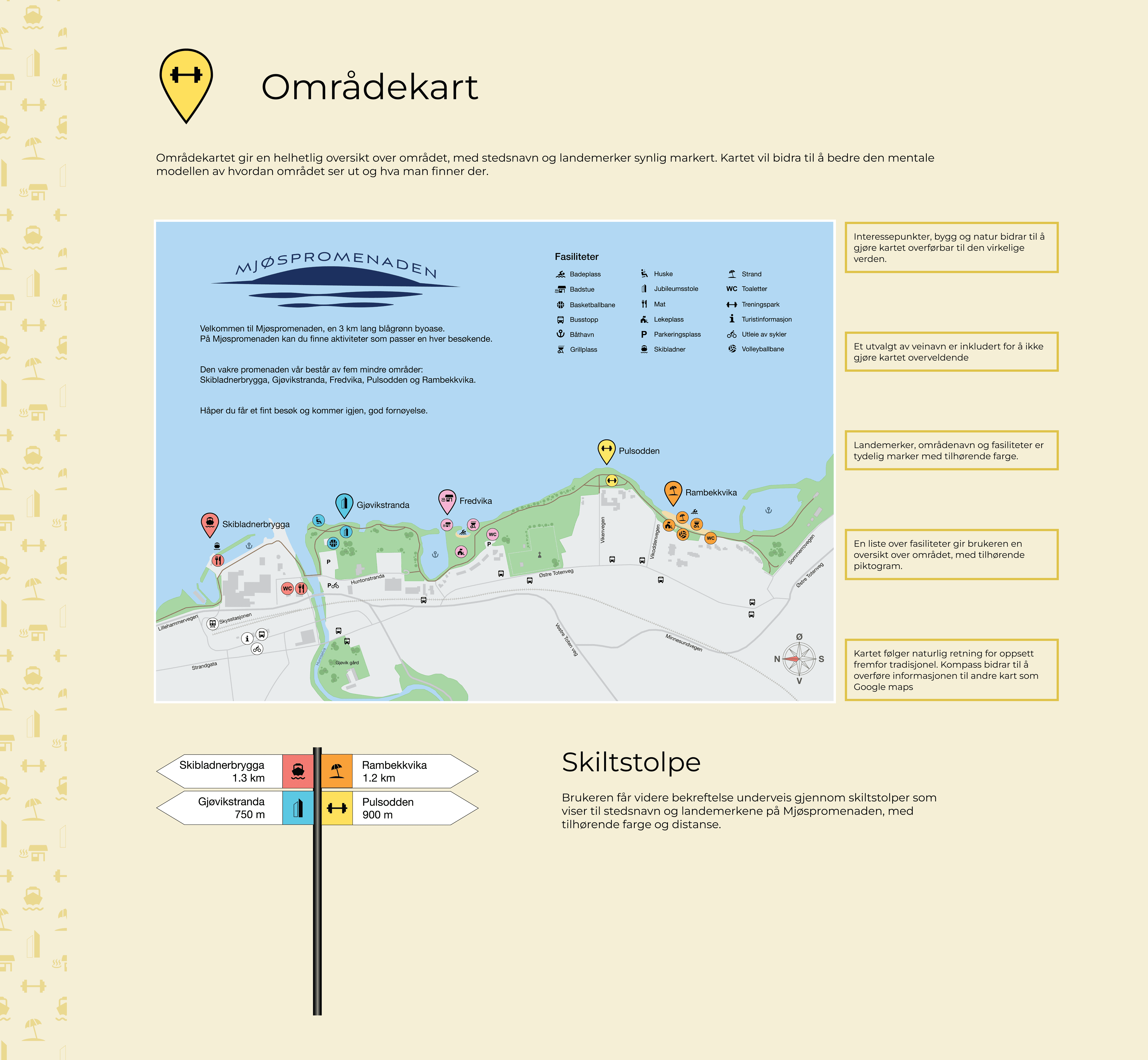 Funnene våre viser at manglende kunnskap og utilstrekkelig kommunikasjon knyttet til Mjøspromenaden bidrar til forvirring og gjør at området ikke blir utnyttet til sitt fulle potensial. Gjennom idéutvikling, prototyping og testing har vi derfor utviklet en rekke anbefalinger og tiltak. Resultatet presenteres i form av en helhetlig kommunikasjonsstrategi som skal redusere forvirringen, øke kunnskapen om området og styrke Mjøspromenadens posisjon som et attraktivt sted å bruke og besøke.
